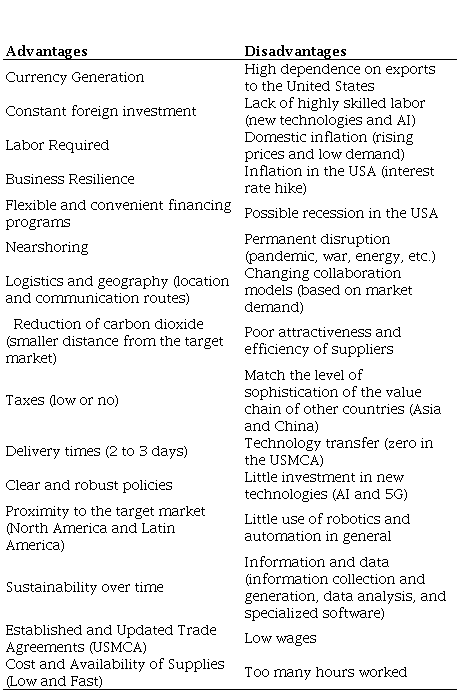 Taking into account the data and information presented in this sector, we can list the advantages and disadvantages that Mexico has over its trading partners Canada and the United States, which are shown in Table 2.