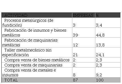 En una caracterización incipiente de las actividades que desarrollan, destacamos inicialmente 2 empresas que desempeñan procesos metalúrgicos de fundición de metales; luego, son mayoritarias las empresas dedicadas a la fabricación de bienes e insumos (44,8%) y maquinarias (13,8%). Dentro de este grupo identificamos una variada composición de empresas con diferentes niveles de complejidad, envergadura y escala: desde la fabricación de pernos, tornillos y clavos; cables; armazones de anteojos; cofres de metal tecnologizados, cajas fuertes y contenedores para servers; cabinas para autos y carrocerías; amasadoras y hornos panaderos; válvulas de seguridad para GNC e hidráulicos; maquinarias para la industria metalmecánica; matrices; minibares y refrigeradores; esterilizadores para uso medicinal y termos, entre otros productos y maquinarias.