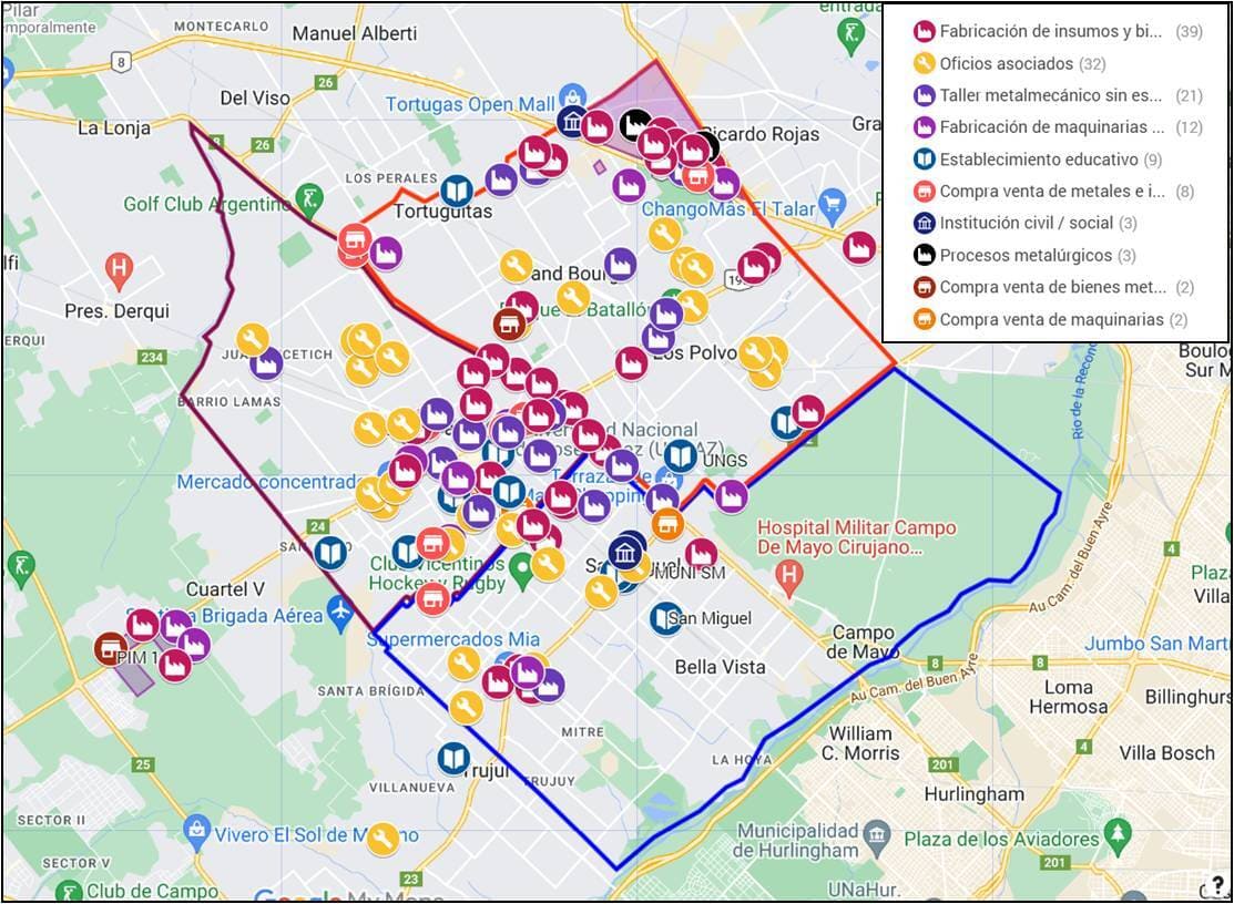 The georeferencing of economic actors (Figure 3) allows us to identify the concentration patterns of the sector, articulated to the steel production nodes through national routes n° 8 and n° 9. Particularly at the intersection of both routes, in the Area of Promotion El Triángulo, is where we find companies dedicated to metallurgical foundry processes. Around this center-periphery axis, as well as the one formed by the provincial Route N°8, is where the metal machinery factories are mostly located (between Malvinas Argentinas and José C. Paz); while the companies dedicated to the manufacture of goods and supplies seem to be more in dialogue with the internal circulation axes of the area (in a north-south direction) through provincial routes n° 23 and n° 24. For their part, the jobs related to the metalworking sector seem to be distributed in the urban fabric of the area without a specific hierarchy. The railway roads do not determine the location patterns of companies, as we could see with the main routes and highways that support automotive transport. Following the categorization of actors of Arocena (1995), it remains to investigate the presence and actions of the chambers and other actors of the union and business sector, identifying at the moment the Association of Mining, Metallurgical and Metalworking Supervisors (ASIMRA), the Metallurgical Workers Union - San Miguel section and the Business Chamber of the Malvinas Argentinas Industrial Park (CEPIMA).