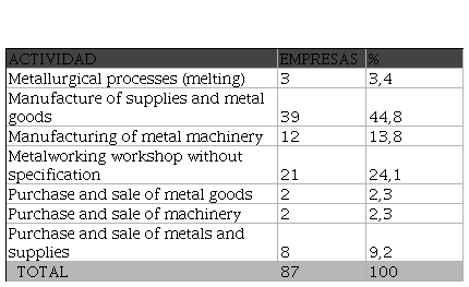 In an initialdescription of the activities they carry out, we initially highlight 2 companies that carry out metallurgical processes of metal casting.The companies dedicated to the manufacturing of goods and supplies are majority (44.8%) and then, the machinery (13.8%). Within this group we identified a varied composition of companies with different levels of complexity, size and scale: from the manufacture of bolts, screws and nails; cables; spectacle frames; technological metal chests, safes and containers for servers; cabins for cars and bodies; dough mixers and bakery ovens; safety valves for CNG and hydraulics; machinery for the metalworking industry; arrays; minibars and refrigerators; sterilizers for medicinal use and thermoses, among other products and machinery.