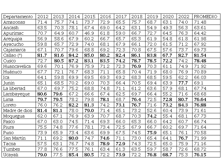Los resultados revelan importantes patrones en la ejecución del gasto a nivel de gobiernos locales en el Perú durante el período comprendido entre 2012 y 2022, la ausencia de datos para el año 2021 plantea interrogantes sobre la disponibilidad y transparencia de la información gubernamental. El análisis detallado de la Tabla 1 destaca la eficiencia en la ejecución del gasto, evidenciada por la codificación de colores, donde la provincia constitucional del Callao se destaca como la más eficiente con un 81.54%, por otra parte, se evidencia que los departamentos que reciben canon minero, como Arequipa, Ancash y Apurímac, ocupan los últimos lugares en la ejecución del gasto, planteando preguntas sobre la gestión de estos recursos.