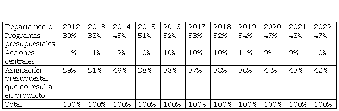 Por otra parte, las acciones centrales se han mantenido en 10% registrando una variación de más menos 2% respecto al valor anterior, además, la asignación presupuestal que no resulta en productos registra que entre 2012 y 2014 existe el mayor porcentaje de gasto, entre 2015 y 2019, el gasto no se registra mayor al 40% y en los últimos 3 años el gasto ha superado el 40% con una variación porcentual de hasta más 4%.