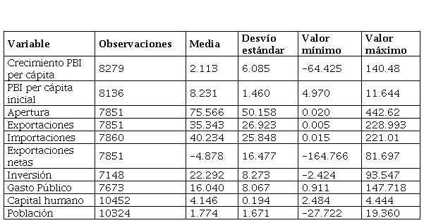 En la Tabla 1, se presentan los principales estadísticos descriptivos para toda la muestra de países. Los datos en general presentan gran variabilidad para el total de países debido principalmente al horizonte temporal considerado y la heterogeneidad de las economías incorporadas al análisis. En particular, las variables asociadas al sector externo presentan mayor variabilidad. El indicador convencional de apertura comercial es la variable con el mayor desvío estándar, seguido por las exportaciones, importaciones y exportaciones netas. Además, estas últimas presentan un valor promedio negativo. Adicionalmente, resulta importante destacar que la tasa de crecimiento anual promedio del PBI per cápita para toda la muestra es de 2,11%, lo que refleja una tendencia positiva a nivel mundial.