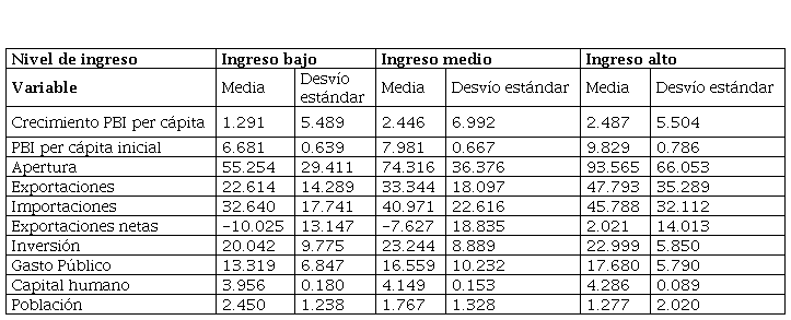 Por su parte, la Tabla 2 muestra los estadísticos descriptivos para cada grupo de países en función del nivel de desarrollo. Para cada uno de estos grupos, se presentan la media y el desvío estándar que toma cada variable analizada.Las estadísticas muestran que los países de ingreso alto son aquellos que más crecen en promedio, siendo además las economías más abiertas en promedio al comercio internacional. Así, los resultados darían cuenta de una relación positiva entre el nivel de desarrollo y el grado de apertura.