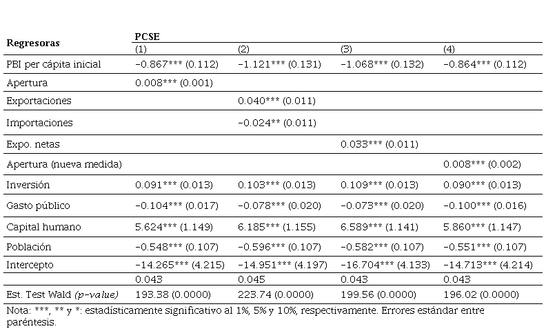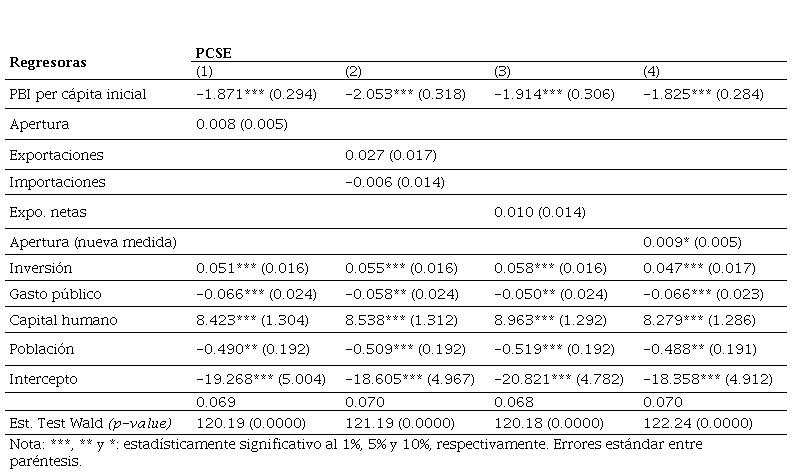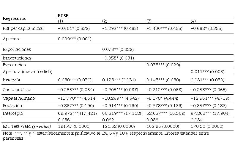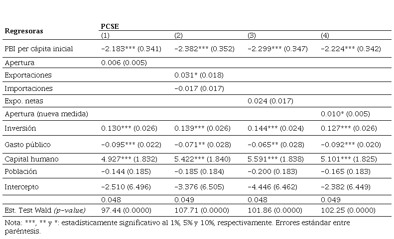Respecto a la submuestra de países de ingreso bajo, las variables de control como la inversión física y el capital humano impactan positivamente en el crecimiento económico de estos países, a diferencia del PBI real per cápita inicial, el gasto público y el crecimiento de la población, que impactan de forma negativa. Por su parte, los efectos de apertura comercial sobre el crecimiento no son robustos, en función de las medidas de apertura consideradas. Bajo esta metodología PCSE la única medida de apertura que resulta significativa (sólo al 10%) es la nueva medida “genuina” creada a partir de (2), e impacta positivamente en el crecimiento. Estos resultados obtenidos para los países de ingreso bajo son llamativos, al ser la nueva medida de apertura construida a partir de la regresión, la única que resulta significativa. Esto sugiere que independientemente de factores geográficos, demográficos o de la capacidad exportadora de petróleo, políticas pro apertura adecuadas podrían contribuir a mejorar el desempeño macroeconómico de largo plazo en aquellas economías más atrasadas.