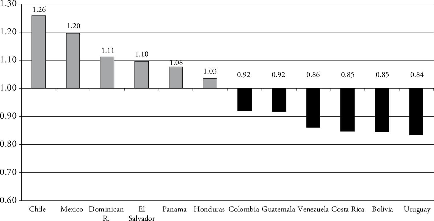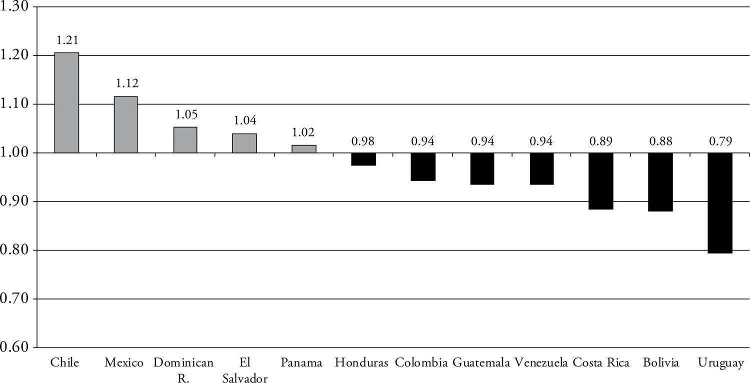 In relation to regional alliances, the results of the weighted support for ALBA among Latin American legislators run counter to the results for both FTAs. As can be seen in Figure 5, Bolivian parliamentarians, sometimes detractors of an FTA with the US, are most favorable to ALBA, and these are followed by Hondurans, Dominicans and Mexicans – all clear supporters of the FTAs. On the other hand, Chile is the country where the legislators are least favorable to ALBA, followed by Guatemala, El Salvador, and Panama; all of which show high support for the FTAs.