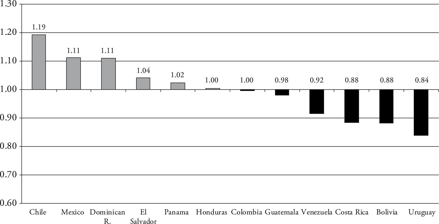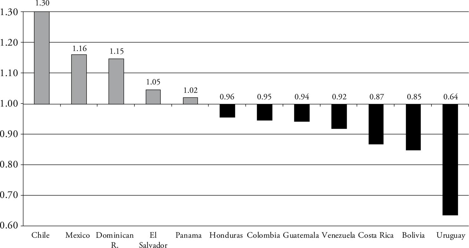 Figures 3 to 6 represent the weighted support for these four FPIs by country. With regard to an FTA with the US (Figure 3), Chilean legislators are the most favorable, followed by legislators from Mexico, the Dominican Republic, El Salvador, Panama, and Honduras. Uruguay is the country whose deputies are the least favorable to an FTA with the US, followed by Bolivia, Costa Rica, Venezuela, Guatemala, and Colombia. Not surprisingly, the open integration axis is clearly in favor of trading with the US, with the exception of Colombia, Guatemala, and Costa Rica.
