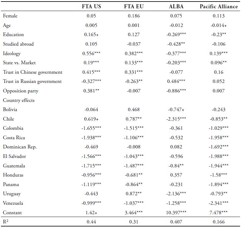 Abstract: The creation of international organizations and the signature of free trade agreements have become common in Latin America. However, few studies have tackled the attitudes of political elites. This work aims to analyze the determinants of support by Latin American legislators for free trade agreements with the US and the EU, and for the Pacific Alliance and ALBA. Results show that ideology, pro-state/market positions, and trustworthiness vis-à-vis Chinese and Russian governments are the main predictors.