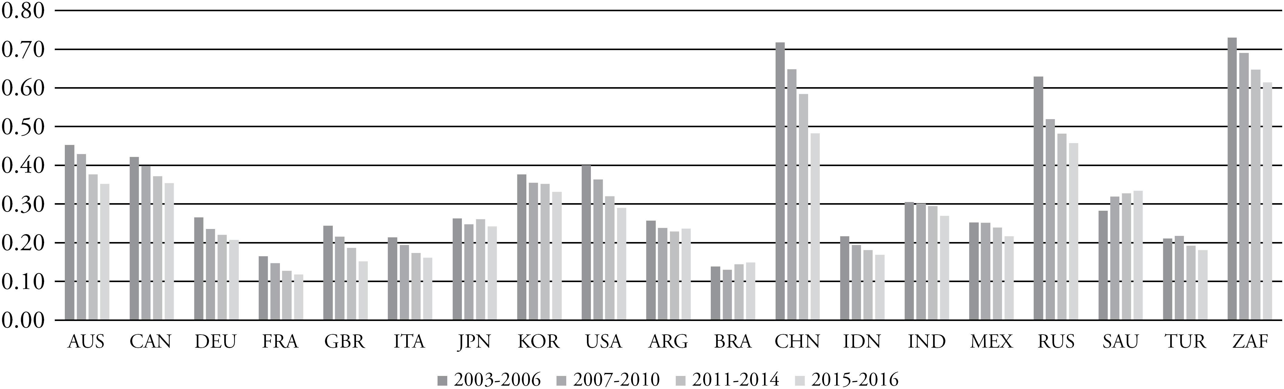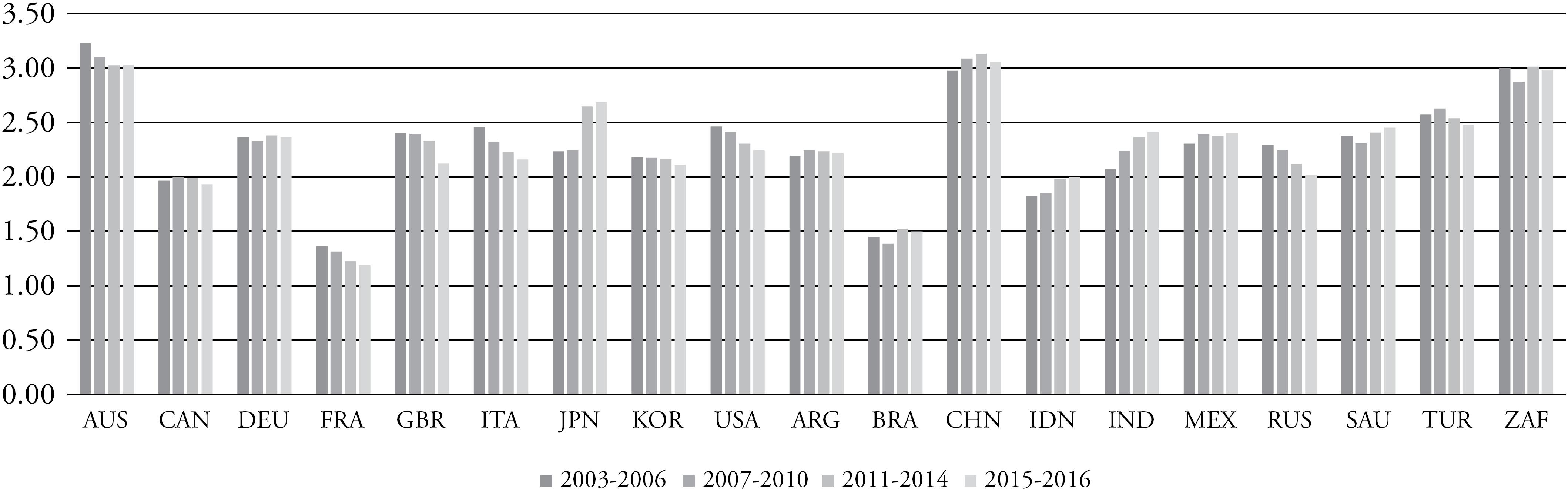 Carbon intensity of global TPES has been roughly stable, increasing by 0.85% between 2003 and 2016. It has on average decreased by 5.18% among G20's industrialized countries and increased by 2.53% among emerging ones (International Energy Agency 2017). But while it has remained roughly stable and high in Australia, in France it was roughly half of Australia's, and it was reduced nonetheless. In Argentina and Turkey, it also remained roughly stable, but in India it has increased by 20.46% in the period.