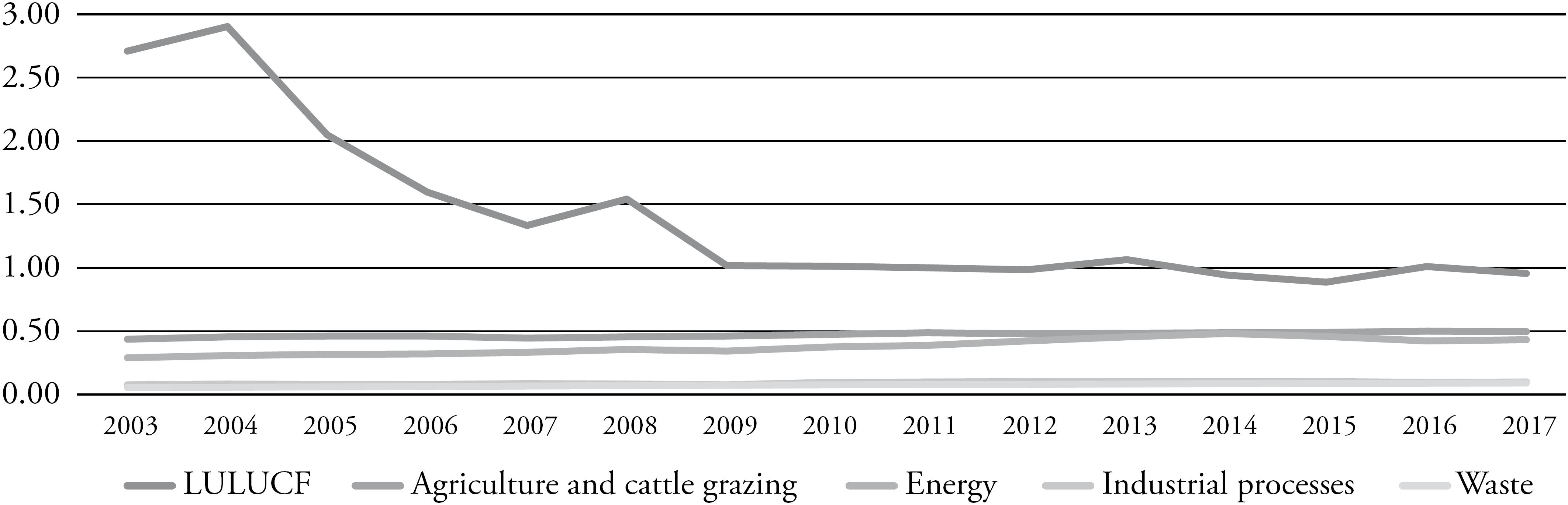 Since 1990, Land Use, Land Use Change and Forestry (LULUCF) have been the greatest drivers of Brazilian emissions. Deforestation, the main driver of Brazilian LULUCF emissions, has always been a major issue in Brazil. By the mid-2000s, Amazon deforestation was finally reduced: from an average 2.31Gt of CO2e/year between 2003 and 2006 to an average 0.95Gt of CO2e/year between 2014 and 2017 (Observatorio do Clima 2018a). Brazilian emissions decreased by 41.95% between 2003 and 2017 because Amazon deforestation was reduced. They could have decreased more if deforestation in the Cerrado biome had been controlled – instead, it increased by 11% in 2017 alone (Observatorio do Clima 2018b).