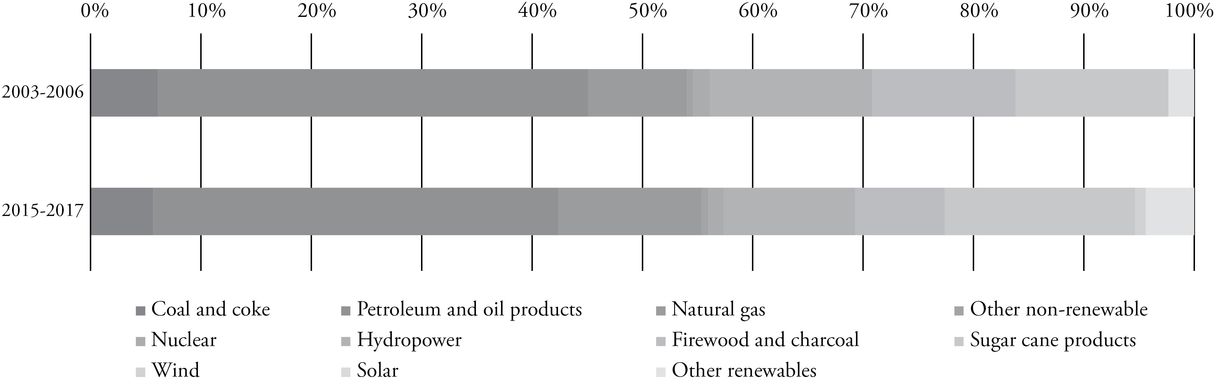 Compared to the global average or to that of G20 peers, the Brazilian energy matrix has higher participation of low carbon sources. While the fossil fuels’ share in G20's average energy matrix was 86.51% between 2003 and 2006, and 84.62% between 2015 and 2017, it averaged 61.14% and 64% in Brazil, respectively (“Statistical Review of World Energy 2018, workbook.” 2018). Between 2003 and 2017, oil and hydropower's shares in the Brazilian energy matrix decreased, from an average 39% and 14.72% between 2003 and 2006 to an average 36.68% and 11.93% between 2015 and 2017, respectively (Empresa de Pesquisa Energética 2018). In the same periods, natural gas and sugarcane products’ shares increased, from an average 8.96% and 13.88%, to an average 12.99% and 17.25%, respectively (Empresa de Pesquisa Energética 2018). Coal's share was small and decreased slightly, as well as firewood and charcoal's; other renewables, including wind and solar energy, still have a very small participation in the matrix (Empresa de Pesquisa Energética 2018).