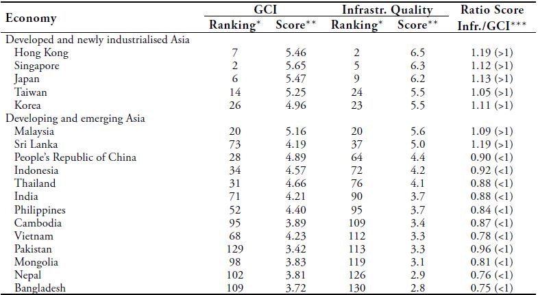 The AIIB’s preference for infrastructure construction is in line with China’s foreign aid and investment policy. The lack of modern roads, motorways, railroads, maritime ports, etc. represents a key barrier hindering the economic growth of South-East Asia ( Asian Development Bank et al. 2005 ), which is evidenced by the low score obtained by most developing Asian economies in the chapter on infrastructures of the Global Competitiveness Report ( Table 1 ). Accordingly, it was estimated that developing countries required financing of US$776 billion per year for infrastructure during 2010–2020 ( Bhattacharyay 2010 ).