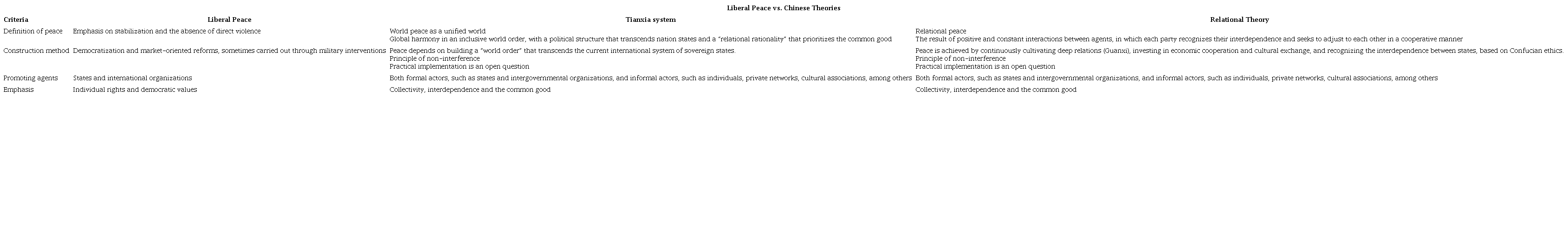 Based on our previous discussion, we prepared the following table, which summarizes the main differences between the liberal peace and the approaches of Zhao Tingyang and Qin Yaqin.