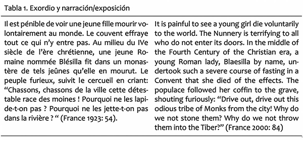 Por nuestra parte, hemos hallado esta superestructura en la mayoría de las traducciones de ensayo que conforman nuestro corpus. Por ejemplo, en “Sur les couvents de femmes”, France se sirve de un exordio breve y contundente, mediante un juicio de valor sobre el objeto de discusión. Asimismo, comenta, desde un punto de vista personal, narraciones históricas y literarias alusivas al Imperio romano y a la obra de Chateubriand, que constituyen la narración/exposición de su ensayo. En la Tabla 1, presentamos el exordio y una parte de la narración/exposición, con la traducción de Alfred Allinson al inglés. En este orden, el autor realiza un despliegue de argumentos con los que sustenta que los conventos son perjuiciosos para las jóvenes, como aquel en el que considera las diferencias de estas comunidades religiones en diferentes países: “Il y eut des couvents pour conserver la science, d’autres pour conserver l’ignorance” (1923: 55). Finalmente, en el epílogo, el autor concluye que la muerte “est l’acte le plus important de la vie religieuse”, con lo que persuade al lector de adherir a su juicio de valor.