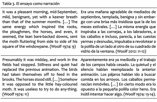 El concepto de narrador ensayista, tratado en el apartado anterior, es también un rasgo característico de la hibridez genérica del ensayo. Por otra parte, cuando se trata de la presencia de la narrativa en el ensayo, María Sánchez Cuervo señala que existe “una clase de ensayo cuyo contenido semántico se desarrolla en forma de narración, que ocupa casi o todo el texto […] que puede contener todos los elementos propios de un texto de ficción” (264). Un ejemplo de ello es “The Death of the Moth”, de Woolf, traducido al castellano por Teresa Arijón (véase Tabla 3).