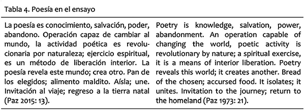 En El arco y la lira, Paz define la poesía, en primer lugar, mediante un orden expositivo-argumentativo, y, en segundo lugar, valiéndose de imágenes metafóricas dispuestas en cadena por medio del recurso reiterativo del isocolon, esto es, la construcción de periodos coordinados sintáctica y semánticamente, que produce efectos sonoros y rítmicos (Beristáin: 279). Lo anterior demuestra no sólo una intención argumentativa, sino además, una voluntad de estilo poética. La estilización del texto importa tanto como el discurrir intelectual. En la Tabla 4 presentamos un fragmento de este ensayo y su traducción al inglés por Ruth Simms.