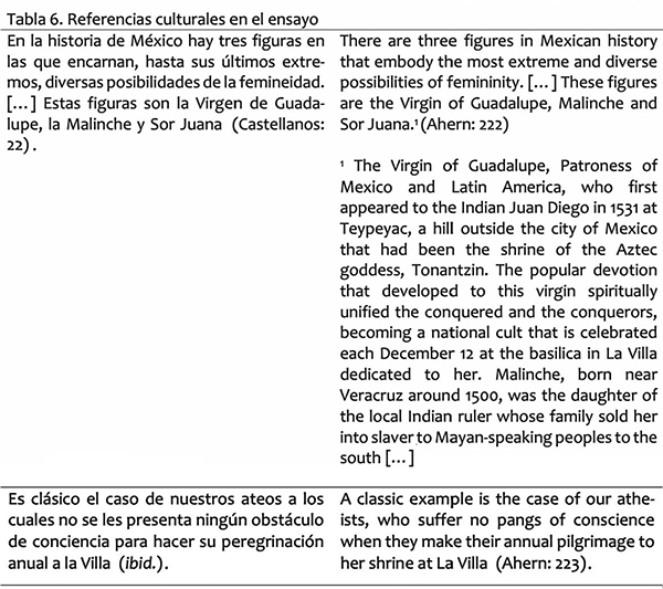 Por otra parte, la mención a referencias culturales permite la conformación de la identidad del narrador ensayista. Citamos en la Tabla 6 un fragmento del ensayo “Otra vez Sor Juana”, de Rosario Castellanos, y la respectiva traducción al inglés de Maureen Ahern. Este ensayo contiene múltiples referencias a la cultura mexicana, pues Castellanos aborda la influencia de tres personajes femeninos, la Virgen de Guadalupe, la Malinche y Sor Juana, extendidos “en sectores muy amplios de la nación” (22). En la traducción al inglés, Ahern hace bien en reconocer que la información que se presenta sobre estos personajes, sin embargo, no resultará necesariamente familiar para el público lector de su traducción, al menos no tanto como sí puede resultarlo para el lector mexicano que accede al texto original. De ahí que incluya una nota al pie donde apunta hechos relevantes para la comprensión de dichas referencias culturales, que además facilita algunas decisiones posteriores de traducción, como la mención de nombres de lugares en castellano. De esta forma, el lector ajeno al contexto mexicano puede comprender las imágenes intermediadoras y acceder a los planteamientos argumentativos del narrador ensayista.