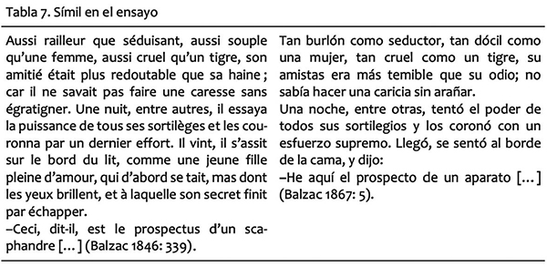 El primero de estos recursos, el símil, no sólo aporta “embellecimiento literario sino que es una herramienta para el pensamiento serio, científico o de otra naturaleza” (Sánchez Cuervo: 266). Si bien Sánchez Cuervo realiza este análisis exclusivamente en la obra ensayística de Woolf, sus aportes son a su vez aplicables a la de otros autores. En la Tabla 7, presentamos un fragmento de Physiologie du mariage, de Balzac, con su traducción al castellano de Alberto Robert. En éste, el prologuista —un primer narrador ensayista— se vale de símiles para describir un “demonio” que hostiga al autor —segundo narrador ensayista, que tomará la palabra a partir del primer capítulo— a escribir un libro sobre el matrimonio. De estos numerosos símiles, Robert ha decidido traducir apenas algunos de ellos.