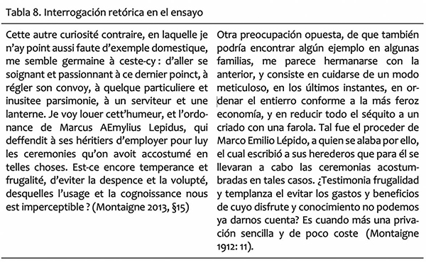 En la Tabla 8, exponemos un fragmento los Essais de Montaigne (L. I, cáp. 3) y su traducción al castellano de Constantino Román y Salamero.