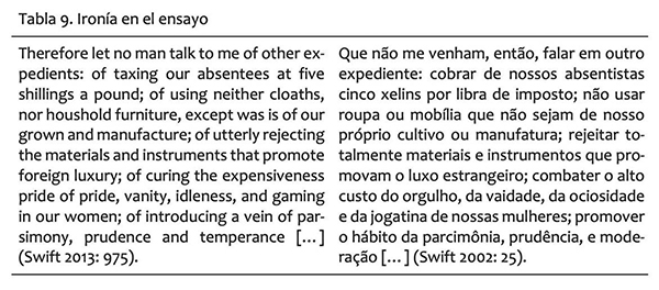 No son pocos los ejemplos de ensayistas que se sirven de esta figura para imprimir en sus textos un tono de burla. En algunos aun este recurso se constituye su impronta personal de estilo, como ocurre, por ejemplo, con algunos ensayistas británicos. Tal es el caso de Swift con “A Modest Proposal”, de Lamb con “A Bachelor’s Complaint of the Behavior of Married People”, de Wilde con “The Decay of Lying” o de Woolf con “Modern Fiction”. Del primero de estos citamos un fragmento y su correspondiente traducción al portugués de José Oscar de Almeyda Marques (Tabla 9). Allí el narrador ensayista, tras haber desarrollado por extenso su propuesta irónica de vender carne de bebés pobres en los mercados de Irlanda, como una manera de contrarrestar la pobreza, advierte a los lectores que no está dispuesto a aceptar un puñado de propuestas lógicas que sí suponen cambios sociales estructurales. Con esta ironía, el narrador ensayista sugiere en verdad lo contrario a lo que afirma: son estas las propuestas a las que adhiere.