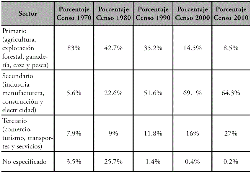 El último censo también evidencia que, pese el incremento del sector de servicios y comercio, la industria manufacturera emplea a la mayoría de la población ocupada. Según los últimos registros del Directorio Estadístico Nacional de Unidades Económicas, el municipio alberga a 418 talleres de confección de ropa (INEGI 2013). Esos talleres son, en su mayoría, familiares y están integrados por dos, cinco o más miembros afiliados por el parentesco ritual o sanguíneo; medianos, que emplean a entre 18 y 40 personas, y grandes, que pueden llegar a contratar más de 180 personas.