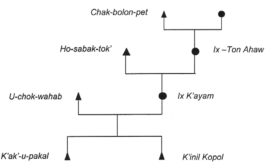 De acuerdo a García (417), en el dintel 3 se manifiesta el carácter dinástico del edificio principal de Las Monjas: ahí se asienta el nombre del bisabuelo materno de K'ak'-u-pakal, llamado Chak-bolon-pet. Asimismo, en los dinteles 7 y 1 se proclama la identidad del abuelo materno, de nombre Ho-Sabak Ahaw (Ho-Sa-bak-Tok'), y en el dintel 3, la identidad de la abuela materna, Ix-Ton Ahaw. Según García (2001), lo anterior es evidencia de un linaje dinástico. No obstante, está consciente que del estudio de las cláusulas nominales epigráficas no puede derivarse la existencia de ningún sistema claro de denominación de descendencia y/o parentesco (404) (ver Figura 2).
