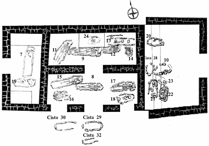 Los sujetos considerados de bajo estatus se caracterizaron por la sencillez de sus ajuares, consistentes en una o dos vasijas de cerámica y uno que otro fragmento de obsidiana. Cinco de éstos fueron depositados afuera de la estructura, principalmente en el patio sur. Por su parte las personas cuyos altos estatus fueron definidos por las ricas ofrendas funerarias, se hallaron en el interior (Pool 1997, 160-165) (ver Figura 3). Asociadas a ellas se encontraron vasijas de cerámica (algunas decoradas y con policromía), cuentas, orejeras y pectorales de jadeíta, elementos zoomorfos de cerámica, pectorales de concha, agujas de hueso (para el trabajo textil), objetos de piedra como manos de metate y maceradores, entre otros (160-165).