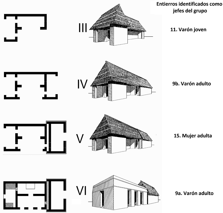 El parentesco y la afinidad en el grupo social se reflejaron en la asociación de los individuos enterrados con sus ajuares funerarios, así como en la identificación de una enfermedad9 recurrente en grupos humanos con endogamia intensa, la spondilitis anquilosante, (ver Arias y Pool 2003; Pool 1997; 2003; Pool y Hernández 2007). Como se mencionó líneas atrás, durante 150 o 200 años, la estructura 1-A tuvo diferentes etapas de modificación. Los arranques de los muros en diferentes niveles de piso y tres entradas clausuradas permitieron la clara identificación de cuatro etapas de crecimiento arquitectónico, reflejo también del desarrollo y longevidad del colectivo social que la habitó. La correspondencia entre esas fases y los personajes ricamente enterrados e identificados como los jefes del grupo (Pool 1997; 2011) nos permitió entender la sucesión de estatus en este grupo. No se observó absoluta unilinealidad, pues al menos una mujer también participó como jefa o principal del grupo (Pool 2003; 2011) (ver Figura 4).