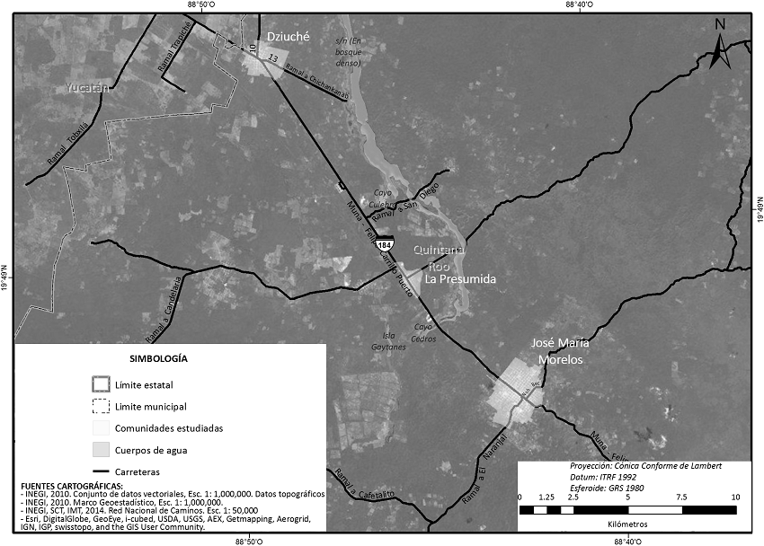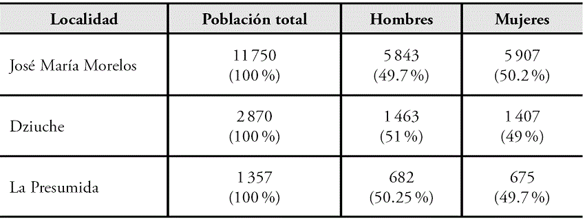 El municipio está integrado por una cabecera municipal homónima; dos alcaldías (Dziuché y Sabán), cuatro delegaciones (La Presumida, Gavilanes, Santa Gertrudis y Candelaria) y 54 subdelegaciones y rancherías. La población total es de 36 179 habitantes; de los cuales 18 506 (51.1 %) son hombres y 17 673 (48.9 %), mujeres, los cuales habitan 8 295 viviendas (Cuadro 1). De las poblaciones estudiadas, la cabecera municipal y Dziuché se consideran suburbanas, mientras que La Presumida se considera rural (INEGI, 2010).