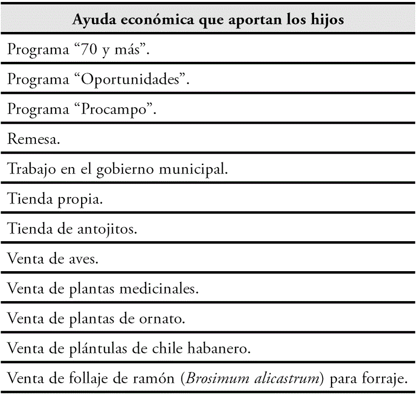 Los ingresos monetarios de la familia pueden ser endógenos -provienen de la venta esporádica o temporal de productos del solar- o exógenos -de orígenes diversos como por ejemplo apoyos gubernamentales (Cuadro 2)-. Estos ingresos promueven cambios en las prioridades familiares que se marcan para el manejo del huerto. Es la presencia de personas de más de 60 años lo que propicia el ingreso externo por apoyos gubernamentales para la tercera edad, por lo que en pocos casos continúan trabajando en el huerto o en la milpa. Lo mismo sucede en el caso de los niños y jóvenes que reciben algún tipo de beca. La consecuencia es la reducción de mano de obra obligada en el trabajo del huerto familiar.