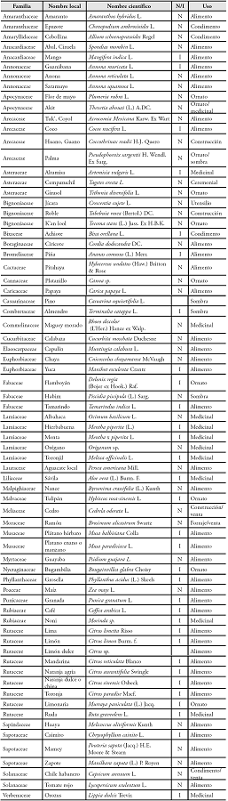 Se registraron 72 especies pertenecientes a 40 familias botánicas (Cuadro 3). Un 52.7 % son especies nativas, lo que significa una reducción de casi 30 % según lo reportado por Barrera (1980) y posiblemente le confiere el mismo porcentaje de similitud con el bosque circundante, de acuerdo con los estudios de otros autores (Barrera-Bassols et al., 2005; Herrera-Castro et al., 2012); mientras que el 47.3 % son especies introducidas. Este porcentaje de introducidas, también sugiere que puede ser directamente proporcional al porcentaje de avance de la transculturación.