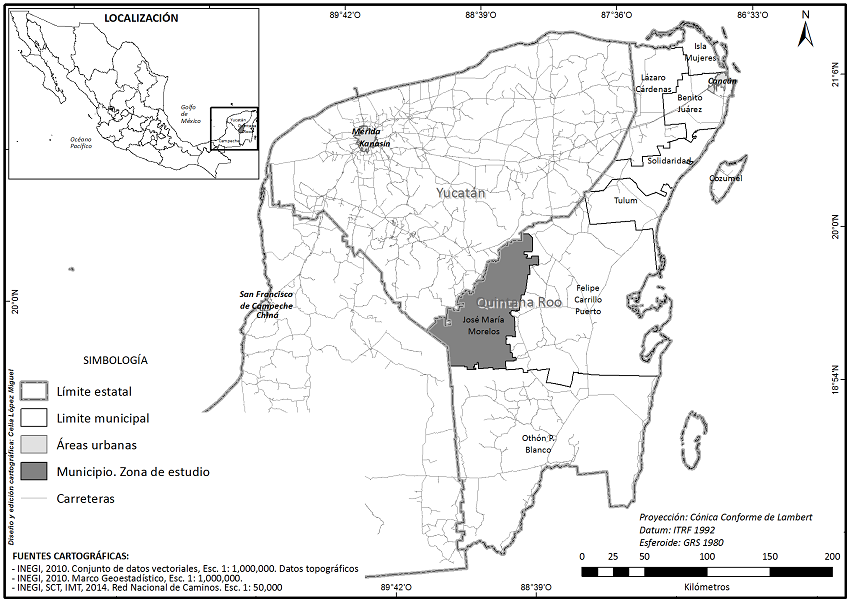 Ahora bien, en las últimas décadas (1984-2014) otro estado peninsular, Quintana Roo, ha tenido fuertes cambios culturales, principalmente a raíz del desarrollo turístico conocido como Riviera Maya y por la ampliación de la carretera que une a dos capitales estatales (Mérida y Chetumal). La estabilidad cultural de la región está afectada por un acelerado cambio de uso de suelo, a raíz de los desmontes inmobiliarios y la instalación de invernaderos y agricultura dirigida, para surtir la demanda del sector turismo. En contraste, en los solares aún se observa gran diversidad de árboles y arbustos, así como animales domésticos (cerdos, gallinas, guajolotes, patos y colonias de abejas), fundamentales en la alimentación familiar (Toledo et al. 2008). Sin embargo, falta conocer con mayor detalle los cambios -y sus causas- en relación con el recurso natural y con el conocimiento tradicional asociado. Este contexto nos motiva a estudiar a los huertos o solares como Unidades Productivas (UP) en un municipio cambiante como es José María Morelos (JMM) en el estado de Quintana Roo.