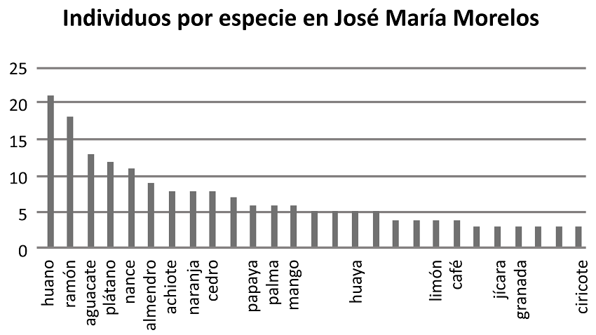 Hemos señalado ya la recurrencia de dos árboles nativos, el ramón (Brosimum alicastrum) y el cedro (Cedrela odorata), y dos introducidos, el naranjo (Citrus sinensis) y el plátano (Musaparadisiaca). Estos resultados coinciden con los datos a nivel peninsular (García de Miguel 2000). Esto significa que el huerto en estas tres poblaciones sigue cumpliendo con la función de suministrar alimentos e ingresos complementarios al grupo familiar. Asimismo, que el modelo original que reportan diversos autores, como ya hemos mencionado, se sigue cumpliendo en el municipio JMM, lo cual nos permitiría cuantificar objetivamente los beneficios obtenidos por cada familia en esa zona, así como la comparación con las diferentes etapas de la urbanización en la zona maya. Nuestros datos no coinciden con inventarios en el sur de Quintana Roo (Kantún-Balam et al. 2012), que mencionan 254 especies, sin embargo concordamos con ese estudio en reconocer la presencia del fenómeno migratorio y una dinámica que genera transculturación.