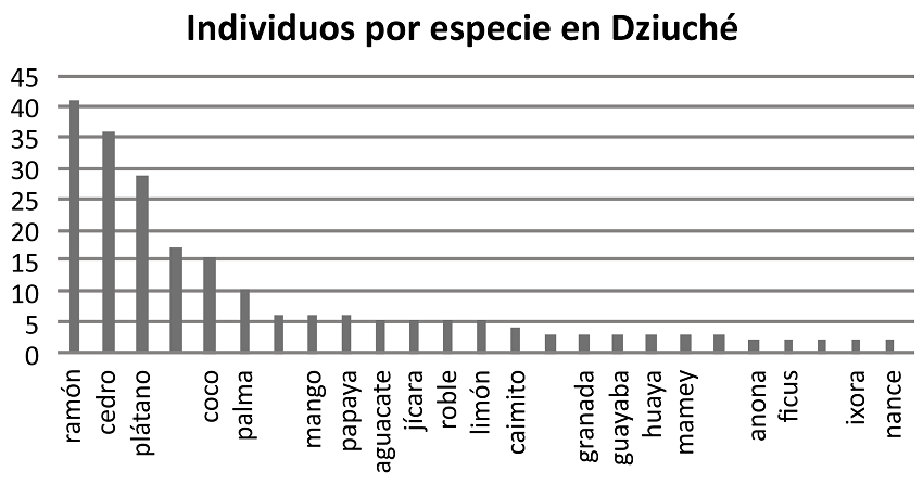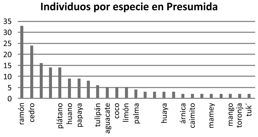 Las plantas arbóreas adultas con un diámetro mayor a 2 cm, además de ser de importancia para el propietario tienen aportación de sombra a la casa y al resto de las especies del solar. El ramón, la naranja y el plátano son el común denominador de las tres poblaciones. En las Figuras 13, 14 y 15 se presenta, usando el nombre local, la abundancia por especie de aquéllas que aportan cobertura con 2 o más individuos o con un diámetro (d.a.p.) ≥ 2 cm.