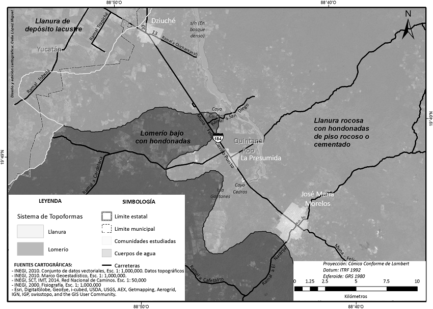 En particular, los objetivos de este trabajo se concentraron en enlistar las especies y sus usos, así como diagnosticar posibles causas de cambios en el manejo de huertos en tres comunidades cercanas entre sí, en el municipio de José María Morelos, que junto con el de José Carrillo Puerto forman la denominada "zona maya" en el centro de la Península de Yucatán. Se trata de una región caracterizada por su gran cohesión cultural, lo que se refleja en la cantidad de mayahablantes, que representan cerca del 90 % de su población (INEGI, 2010). JMM se ubica al Norte 20° 19', al Sur 19° 14' de latitud Norte, al Este 88° 24' y al Oeste 89° 19' de longitud Oeste (Figura 1); con una superficie de 6 739 km2. La cabecera municipal, del mismo nombre, se ubica casi medio camino entre las capitales Mérida y Chetumal (Figura 2), en un contexto topográfico que presenta relieves poco pronunciados (Figura 3).