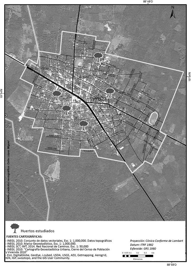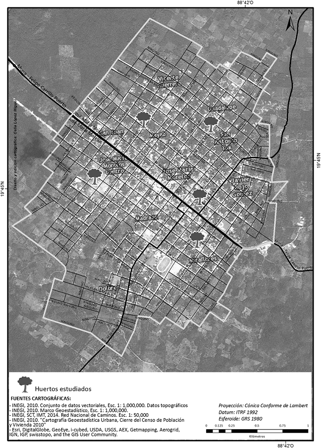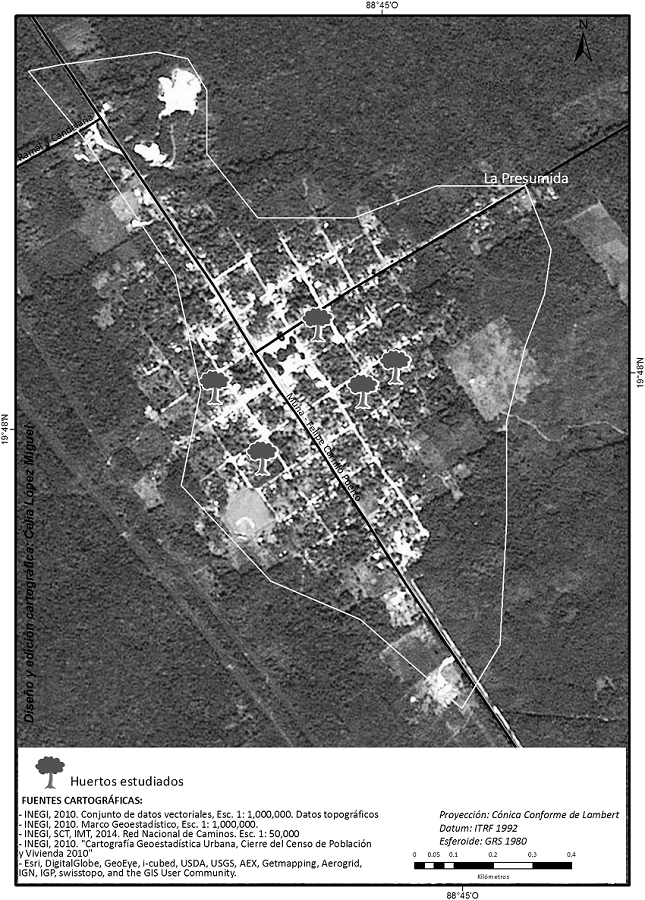 Las comunidades estudiadas mantienen un estatus intermedio entre la condición rural y la urbanizada. Aun cuando las tres tienen diferente extensión y número de habitantes, no se observan diferencias significativas entre ellas en cuanto al grado de transculturación. Se encontraron características distintivas de lo rural incluso en los huertos ubicados en el primer cuadro del centro de cada poblado, con huertos familiares biológicamente diversos y con elementos de cultura maya local. El huerto o solar forma parte importante de una unidad familiar de producción y, en algunos casos, cuenta con una parcela complementaria donde principalmente se siembra maíz para autoconsumo. En esos casos, el solar se convierte en un semillero y en el espacio para la adaptación de nuevas plantas, así como su germinación y la vigilancia de su crecimiento temprano. La ubicación de los huertos seleccionados no muestra un patrón en relación con la distancia al centro del pueblo (Figuras 4, 5 y 6).