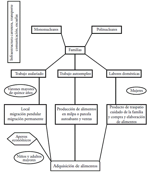 Como parte de la dinámica del modelo de desarrollo orientado hacia el exterior, en México se han consolidado grandes empresas dedicadas a la producción y distribución de alimentos, lo que ha generado efectos negativos sobre la economía rural y en los hogares campesinos, como el abandono gradual de actividades de autoconsumo, migración y un incremento en la producción y consumo de alimentos no tradicionales (Teubal 2001, 60; Gutiérrez y Magaña 2017). Ante este panorama, la unidad doméstica campesina se ha tenido que adaptar a las condiciones socioeconómicas cambiantes y ha diversificado sus actividades (Ariza y Oliveira 2001,10); a pesar de ello existen graves problemas de malnutrición, saneamiento, escolaridad y acceso a los servicios de salud, entre otros, además de que el fenómeno migratorio ha favorecido la desaparición gradual de los actores tradicionales en el campo mexicano (Bonfil 1996, 6; Teubal 2001, 61).