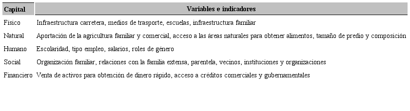 Los capitales antes mencionados se describen como sigue: el humano se refiere a los integrantes de la unidad familiar e incluye sus habilidades y el conocimiento que se aporta para la sobrevivencia, mientras que el natural hace referencia a suelo, agua y biodiversidad; el capital físico se refiere a la infraestructura y servicios, así como la tecnología que se encuentra disponible y es aprovechada por la familia; en cuanto al capital social, en éste se consideran las relaciones entre los diferentes miembros de la comunidad y la participación en organizaciones e instituciones que se encuentran en el entorno que facilita el acceso a otros recursos; finalmente, el capital financiero comprende los activos fácilmente convertibles en dinero y el acceso a créditos monetarios (Craviotti 2012, 546; Pat et al. 2010; Ávila y Ramírez 2015, 62).