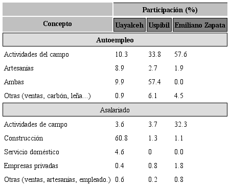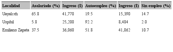 En Uayalceh se observó un mayor porcentaje de personas con empleo asa lariado, mientras que el autoempleo no fue relevante. El empleo fuera de la localidad en el sector de la construcción fue el más recurrente entre los varones, tanto jefes de familia como hijos mayores de 15 años, los cuales son contratados con un salario fijo. Esto último coincide con lo reportado por diferentes autores (Attanasio y Szekely 2001, 18) para localidades rurales del país, sobre todo en aquellas cercanas a las zonas urbanas, que demandan mano de obra no calificada. En contraste, en las comunidades de Uspibil y Emiliano Zapata se observó que la mayoría de los habitantes realiza actividades productivas de autoempleo, donde el trabajo en el campo constituye la principal ocupación.
