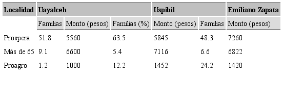 Otro ámbito de la relación social es la que se establece entre las unidades domésticas de la comunidad con representantes del gobierno federal y estatal, la cual se encuentra plasmada bajo la reglamentación del plan del gobierno. Un ejemplo de lo anterior es el programa denominado "La cruzada contra el hambre". Además de este programa se tiene otros adicionales, como Oportunidades, 65 y Más, Proagro (Cuadro 4), entre otros (Morales et al. 2013, 203). Así, estos programas se vinculan con las familias, las cuales adaptan sus estrategias de subsistencia en función de los recursos económicos obtenidos a través de los apoyos.