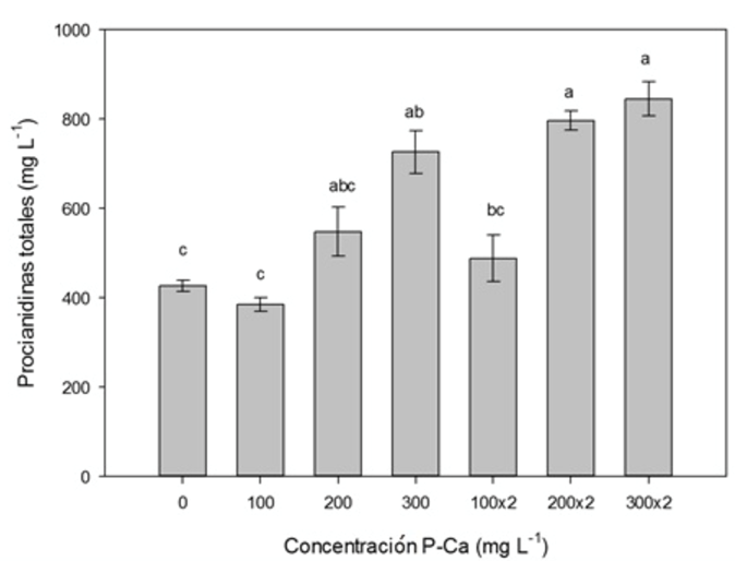 La aplicación de P-Ca incremento los niveles de antioxidantes en los frutos maduros del cultivar Shiraz. El contenido de procianidinas (Figura 1), polifenoles totales (Figura 2) y antocianinas totales (Figura 3) aumentó de forma significativa (p ≤ 0.05) con las diferentes concentraciones de PCa. En la elaboración de vinos, los tres antioxidantes referidos contribuyen a producir un vino de mejor calidad (Lee et al. 2005). Las procianidinas proporcionan astringencia en los vinos, por lo que su contenido en los frutos influye de forma directa con la calidad final del vino (Vaquero-Fernández et al. 2006). Al respecto Kok y Bal (2014) reportan en el vid cultivar Gewürztraminer incrementos de monoterpenos en frutos cuando se aplicó P-Ca en dosis de 200 y 300 mg L-1.