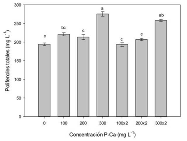 En la Figura 3 se observa el efecto de P-Ca en el contenido de antocianinas totales en los frutos. El tratamiento con P-Ca a 200 mg L-1 en dos aplicaciones incrementó de forma significativa (p ≤ 0.05) el contenido de antocianinas, que fue un 67 % mayor al contenido de los frutos del tratamiento testigo. Los tratamientos con P-Ca a 300 mg L-1 asperjado en una ocasión y 100 mg L-1 en dos aplicaciones tuvieron un 32 % de incremento en el contenido de antioxidantes.
