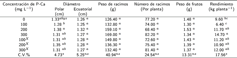 La Tabla 1 muestra que el diámetro ecuatorial del fruto no fue modificado por la P-Ca; sin embargo, mientras el diámetro polar fue ligeramente menor en el tratamiento con 100 mg L-1 de P-Ca aplicado en una ocasion, este parámetro mostró un incremento del 3 % en el tratamiento P-Ca a 200 mg L-1. El peso y número de racimos; así como el peso individual de fruto no mostraron cambios estadísticos entre los tratamientos con P-Ca. Las plantas que recibieron en una ocasion el tratamiento con 300 mg L-1 de P-Ca mostraron un incremento en rendimiento del 53 % (Tabla 1).