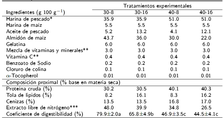 Se elaboraron cuatro dietas experimentales a base de harina y aceite de pescado con 30 y 40% de proteína cruda y, 8 y 16% de lípidos, respectivamente (Tabla 1). Los insumos se pesaron en una báscula analítica (Nimbus®), con precisión de ± 0.1 g, posteriormente se mezclaron con una maquina mezcladora (Blazer®, modelo 810), para tener una pasta homogénea, luego la pasta se pasó a un molino de carne (Torrey® modelo M-12-F5) para obtener pellets de un diámetro aproximado de 3 mm. El material resultante se secó una estufa de convección (NOVATECH®) a o80 C por 24 h, para luego almacenarlo a -20 oC, hasta su uso.