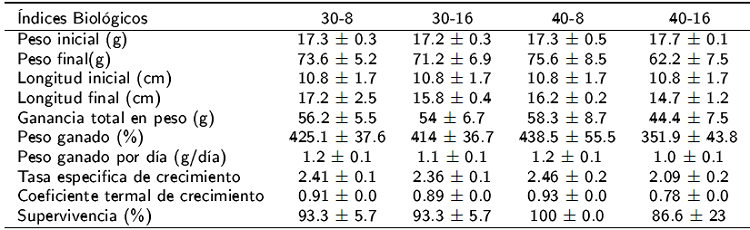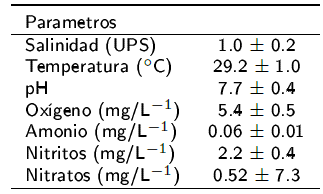 El sistema experimental consistió de 12 reservorios de 350 L de capacidad, conectados con un sistema de recirculación (sistema de biofiltración y lámpara de luz UV), para mantener la calidad del agua. El experimento tuvo una duración de 60 d, cada uno de los tratamientos experimentales se realizó por triplicado y se colocaron 10 organismos por unidad experimental. La temperatura se mantuvo a 29.02 ±1.0 oC con ayuda de calentadores con termostato. Se tomaron muestras de agua una vez por semana para determinar la concentración de amoniaco, nitritos, nitratos y pH (fotómetro YSI 9500®). El oxígeno disuelto y la temperatura se registró con un oxímetro (YSI 550A®). Al inicio del experimento los peces se alimentaron con una ración equivalente al 8% de su biomasa inicial. Cada 15 d los peces se pesaron en (g) y medieron en mm. Los reservónos se limpiaron todos los días y se registró la supervivencia durante los 60 d del experimento. Los peces se alimentaron a las 9:00, 14:00 y 18:00 todos los días hasta saciedad.