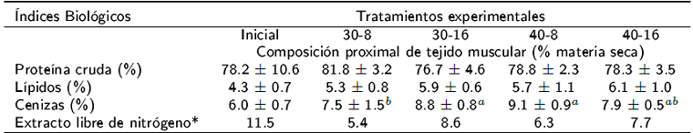 La determinación de humedad, proteína total, grasa total y cenizas de los alimentos y del músculo se realizaron siguiendo los protocolos de la AOAC (1995). Los músculos de tres peces de cada unidad experimental se mezclaron para los análisis. La determinación de humedad se realizó por diferencia gravimétrica, pesando 1.0 g de muestra, para luego secarlo en una estufa a 100 oC, hasta peso constante. La determinación del contenido de proteína cruda se realizó con el método de micro Kjeldahl y se multiplico por el factor de 6.25. El contenido de lípidos se determinó con el método de extracción de Soxhlet con la ayuda de hexano como solución extractora. Las cenizas se determinaron por calcinación de una muestra en una mufla a 550 oC por 6 h. La determinación del extracto libre de nitrógeno se calculó por la diferencia de la materia seca con la formula ELN = 100 - (% proteína cruda + % lípidos totales + % de cenizas.