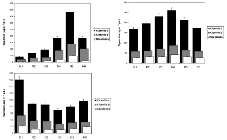 La deficiencia de N, P o K suprimió el crecimiento, aceleró la senescencia y disminuyó las concentraciones de los pigmentos cloroplásticos (Kumar Tewari et al. 2007). La deficiencia de los principales componentes estructurales, como el nitrógeno (N) o el fósforo (P), se espera que reduzca la frecuencia de los portadores de electrones de los sistemas de transporte de electrones (Grossman y Takahashi 2001). La deficiencia de potasio (K) retarda la absorción de CO2 debido al cierre estomático, lo que conduce a la acumulación del poder reductor (NADPH), sobre-reducción de los portadores del transporte de electrones y la generación del radical superóxido (O2-) y otras especies de oxígeno reactivo (Grossman y Takahashi 2001). La senescencia, es una consecuencia importante de la deficiencia de N o P y el estrés oxidativo comparten síntomas comunes, como la pérdida de pigmentos y proteínas cloroplásticas, la peroxidación lipídica y las alteraciones de la membrana, lo que conduce a una disminución progresiva de la capacidad fotosintética (Kumar Tewari et al. 2007). La aplicación de N favoreció la acumulación de clorofila a, b y carotenos, presentando la máxima concentración la dosis de 18 mM, de la misma manera la aplicación de P favoreció la acumulación de pigmentos, presentando la dosis de 4.0 mM, la mayor acumulación; mientras que para el K presentó un comportamiento inverso al N y P, presentando la mayor acumulación de pigmentos la dosis de 1.0 mM.