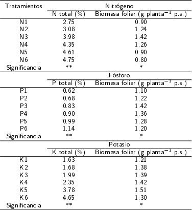 La producción de biomasa foliar se obtuvo del promedio de peso por planta con base en materia seca (g). Mientras que la concentración foliar de N, P y K en % se obtuvo de las hojas, las cuales se trituraron hasta obtener un polvo para determinar el contenido total de N con un analizador orgánico elemental (FLASH 2000 analizador, Thermo ScientificTM ). El contenido total de P se determinó con un espectrofotómetro UV-VIS por el método del molibdato-vanadato, después de digerir las muestras con HN03 concentrado (65%) y H2O2 (30%); en tanto que el contenido total de K se determinó con el método de espectroscopia de absorción atómica (ASS, Thermo ScientificTM ) (Sadzawka et al. 2007).