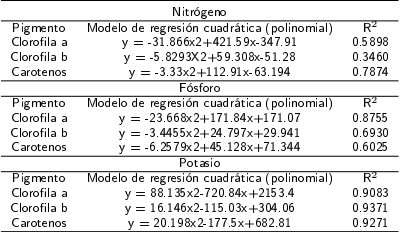 La correlación entre el estado nutricional del K, pigmentos foliares y biomasa, indica correlación positiva y significativa entre los diferentes pigmentos foliares y el estado nutricional del K (Tabla 3). En la Tabla 4, se presentan las ecuaciones del modelo polinomial y sus coeficientes de determinación (R2). Para el N, los modelos de regresión cuadrática (polinomial) fueron significativos para clorofila a, b, y carotenos, presentando el valor máximo de R2 la concentración de carotenos. Para el P, la clorofila a tuvo la R2 más alta, mientras que para el K fue la clorofila b que tuvo los mayores valores. Los modelos de regresión polinomial determinados representan el comportamiento de los pigmentos fotosintéticos estudiados en base a las dosis de N, P y K aplicados.
