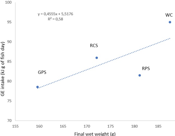 Diets containing starch had no incidence on ingestión rate (p > 0.05) but a positive correlation was observed between final wet weight and ingestión rate (Figure 1). TGC valúes were similar whatever treatment (p > 0.05, Table 2).Diets containing starch had no incidence on ingestión rate (p > 0.05) but a positive correlation was observed between final wet weight and ingestión rate (Figure 1). TGC valúes were similar whatever treatment (p > 0.05, Table 2). Hematocrit (%) was similar for all treatments (p > 0.05, Table 3) as well as plasma glucose level (p > 0.05). Liver glycogen content peaked at 214 ±14 mg g-1 with waxy cornstarch (p < 0.05); hepatosomatic Índex did not change (p > 0.05). Specific activity of α-amylase gave a mean valué of 2768 U and 448 U for pyloric caeca and intestine respectively and α-glycosidase (mean valué 610 U and 487 for pyloric caeca and intestine respectively did not differ whatever dietary treatment (p > 0.05).